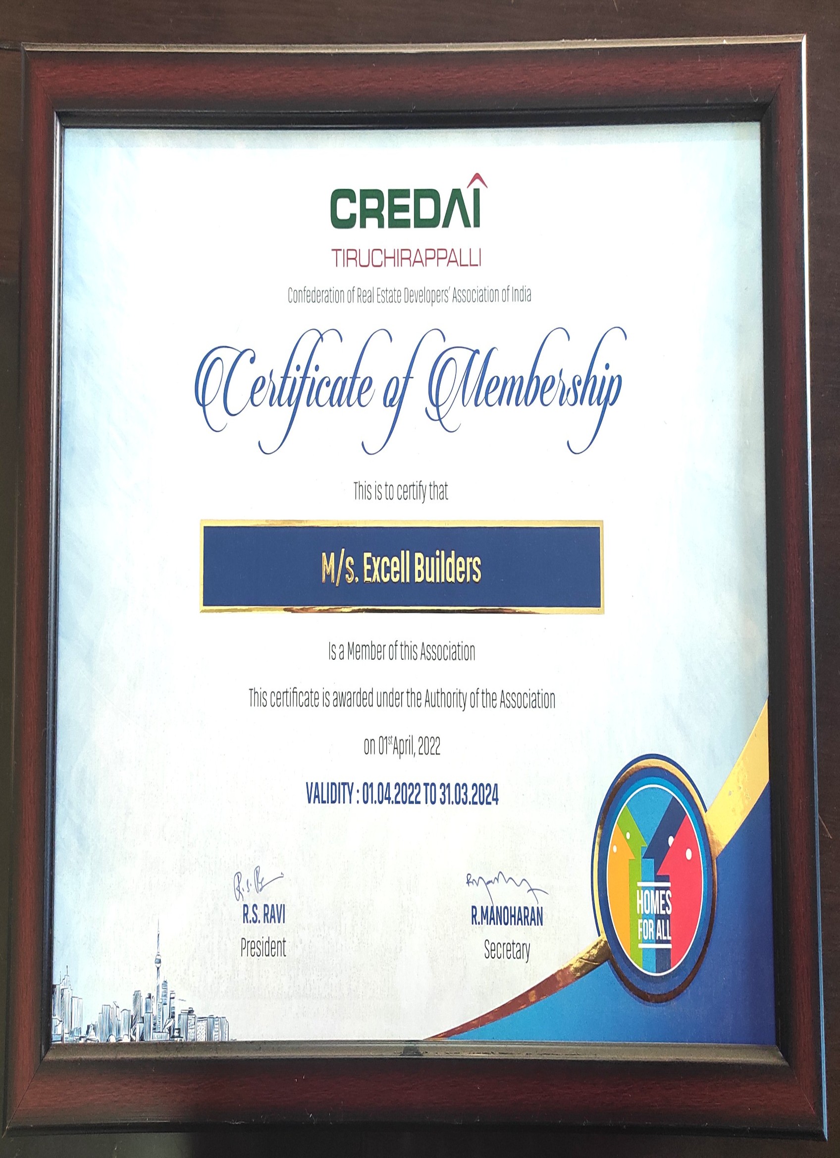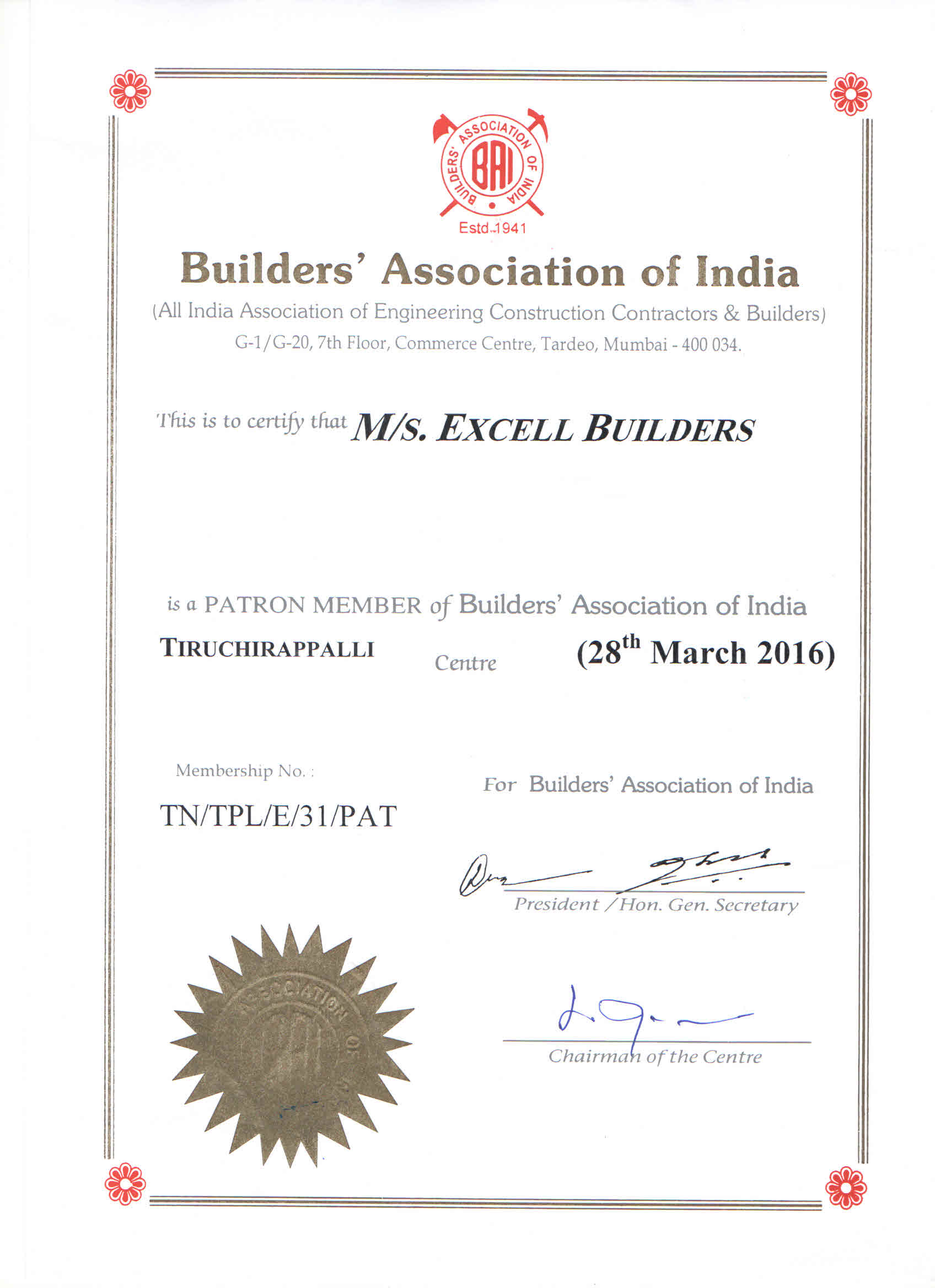 Builders Association Of India All India President Mr.Avinash Patil Honouring M/s Excell Builders.